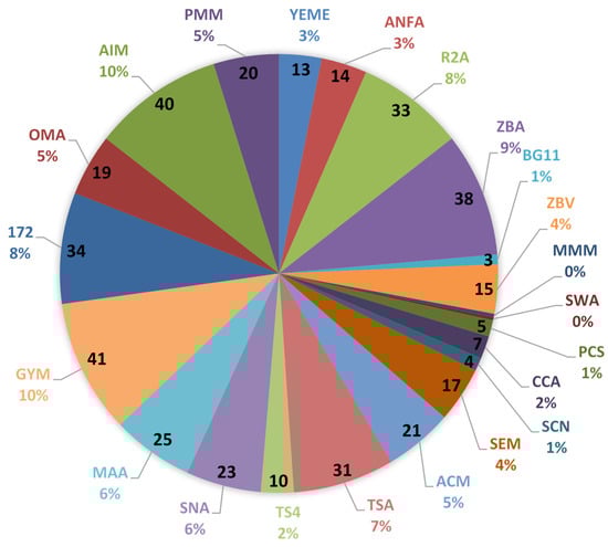 A total of 415 unique bacterial colonies, as judged by their morphology (size, shape, colour and texture), were isolated from the two sponge samples with PE09 yielding 273 isolates and 142 bacterial isolates from PE07, respectively. The fewest number of isolates were obtained from samples growing in liquid enrichment medium and from the heat treated medium, which yielded 5 and 12 isolates respectively. This could be due to the selectivity in the liquid enrichment medium which was meant to select for nitrogen fixing bacteria. In the case of heat treatment, the low viable microbial numbers post treatment indicate that the number of spore-forming bacteria are low in these marine sponges or that sporulation had not been induced in spore formers at the time of harvest []. The antibiotic treatment yielded 37 isolates while the non-treated medium resulted in 361 bacterial isolates. GYM was the medium which resulted in the highest number of bacterial isolates (40) which accounted for 10% of the total isolates. AIM and ZBA resulted in 39 (10%) and 37 (9%) isolates respectively (Figure 2). The medium which resulted in the fewest bacterial isolates were MMM and Seawater Agar (SWA) since each contributed only one bacterial isolate. Both media discourage growth of fast growing bacteria thus resulting in fewer numbers of microbial isolates.