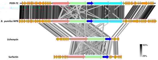 tBLASTx comparison of lichenysin-like pathway identified in PE09-72 with the lichenysin and surfactin pathways as well as the most similar pathway identified on a genome currently on Genbank. Gene annotations are as follow: Pink—condensation domain containing protein; Green—condensation domain containing protein; Dark blue—condensation domain containing protein which includes a thioesterase domain; Light blue—two “extra” genes present in the pathway from PE09-72 which contain ketoreductase domains, the downstream gene also contains a thioesterase domain; Orange—other ORF’s (biosynthetic and transport related) identified by antiSMASH which delineates the extent of the pathways. Similarity at the amino acid level in the repeated domain structures results in the criss-cross pattern observed when comparing the biosynthetic genes.