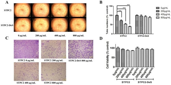 The effect of STPC2 and STPC2-DeS on the formation of capillary tube-like structures was evaluated in a matrigel-based assay as previously reported [25]. Briefly, a 96-well plate pre-coated with 50 μL matrigel each well was solidified at 37 °C for 1 h. Human umbilical vein vascular endothelial cells (HUVECs) were trypsinized, and supplemented with RPMI 1640 only or containing different doses of STPC2 or STPC2-DeS (0, 200, 400, and 800 µg/mL). The plate was incubated again for additional 24 h. The enclosed capillary network was photographed by an Olympus IX51 digital camera (Tokyo, Japan). Quantification of the inhibition of tube formation was analyzed by Image J software (NIH, Bethesda, MD, USA).