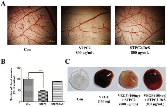 The chorioallantoic membrane (CAM) assay, an in vivo platform for the study of vascular development and angiogenesis was conducted as previously described [17]. Briefly, fertilized chick eggs were incubated at 37 °C in a humid atmosphere. After one week, the eggshell was cracked and peeled away over the airspace to open a small window. A 0.5 cm × 0.5 cm sheet of filter paper soaked with saline (control) or saline containing STPC2 (800 µg/mL) or STPC2-DeS (800 µg/mL) was covered on the chorioallantoic membrane. The eggs were sealed tightly and maintained in the incubator for another 48 h. Finally, the CAMs were taken to photograph with a microscope (Olympus BX510, Japan) after fixation (methanol:acetone = 1:1).