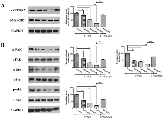 HUVEC cells were serum-starved for overnight and then incubated with different concentrations of STPC2 (0, 200, 400, and 800 µg/mL) or STPC2-DeS (800 µg/mL) for 1 h. After that, the cells were lysed with RIPA buffer, according to the manufacturer’s instruction (Cell Signaling Technologies, Shanghai, China). The concentrations of proteins were determined by BCA protein assay kit (Beyotime, Haimen, Jiangsu, China). Equivalent amounts of proteins from different treatments were electrophoresised on SDS-PAGE gels and transferred to a polyvinylidene difluoride (PVDF) membrane (Bio-Rad, Hercules, CA, USA). Blots were performed with epitope-specific primary and secondary antibodies. Anti-VEGFR2 antibody, anti-VEGFR2 (phospho Y1054/1059) antibody, anti-FAK anbibody, anti-FAK (phospho Y397) antibody, anti-Src antibody, and anti-Src (phospho Y418) antibody were got from Abcam. Anti-Akt and phospho-Akt (Thr308) antibodies were purchased from Cell signaling technology. Finally, enhanced chemiluminescence (ECL) reagent was applied for signal detection. The data were quantified and normalized using image J software.