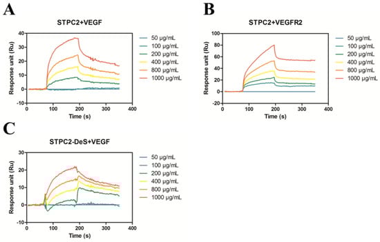 The interaction of native polysaccharide STPC2 with VEGF or VEGFR2, and desulfated derivative STPC2-DeS with VEGF by Biacore 3000. Sensorgrams obtained from the injection of STPC2 or STPC2-DeS over the immobilized VEGF or VEGFR2 surface at the concentrations of 50, 100, 200, 400, 800, 1000 µg/mL. (A) Injections of STPC2 over the immobilized VEGF surface at the concentrations of 50, 100, 200, 400, 800, and 1000 µg/mL; (B) Injections of STPC2 over the immobilized VEGFR2 surface at the concentrations of 50, 100, 200, 400, 800, and 1000 µg/mL; (C) Injections of STPC2-DeS over the immobilized VEGF surface at the concentrations of 50, 100, 200, 400, 800, and 1000 µg/mL.