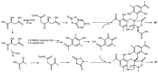 In 2012, two highly oxygenated polyketides, penilactones A and B (67 and 68) (Figure 7) of related structure but opposite absolute stereochemistry, were isolated from the Antarctic deep-sea derived fungus Penicillium crustosum PRB-2. The nuclear factor-κB (NF-κB) inhibitory activities of 67 and 68 were tested by means of transient transfection and reporter gene expression assay, and only 67 showed weak activity with an inhibitory rate of 40% at a concentration of 10 μM. A plausible biosynthetic pathway for 67 and 68 was proposed as shown in Scheme 2 [43]. The penilactones contain a new carbon skeleton formed from two 3,5-dimethyl-2,4-diol-acetophenone units and a γ-butyrolactone moiety, and have been prepared by a biomimetic synthesis reported the following year as shown in Scheme 3 [44].