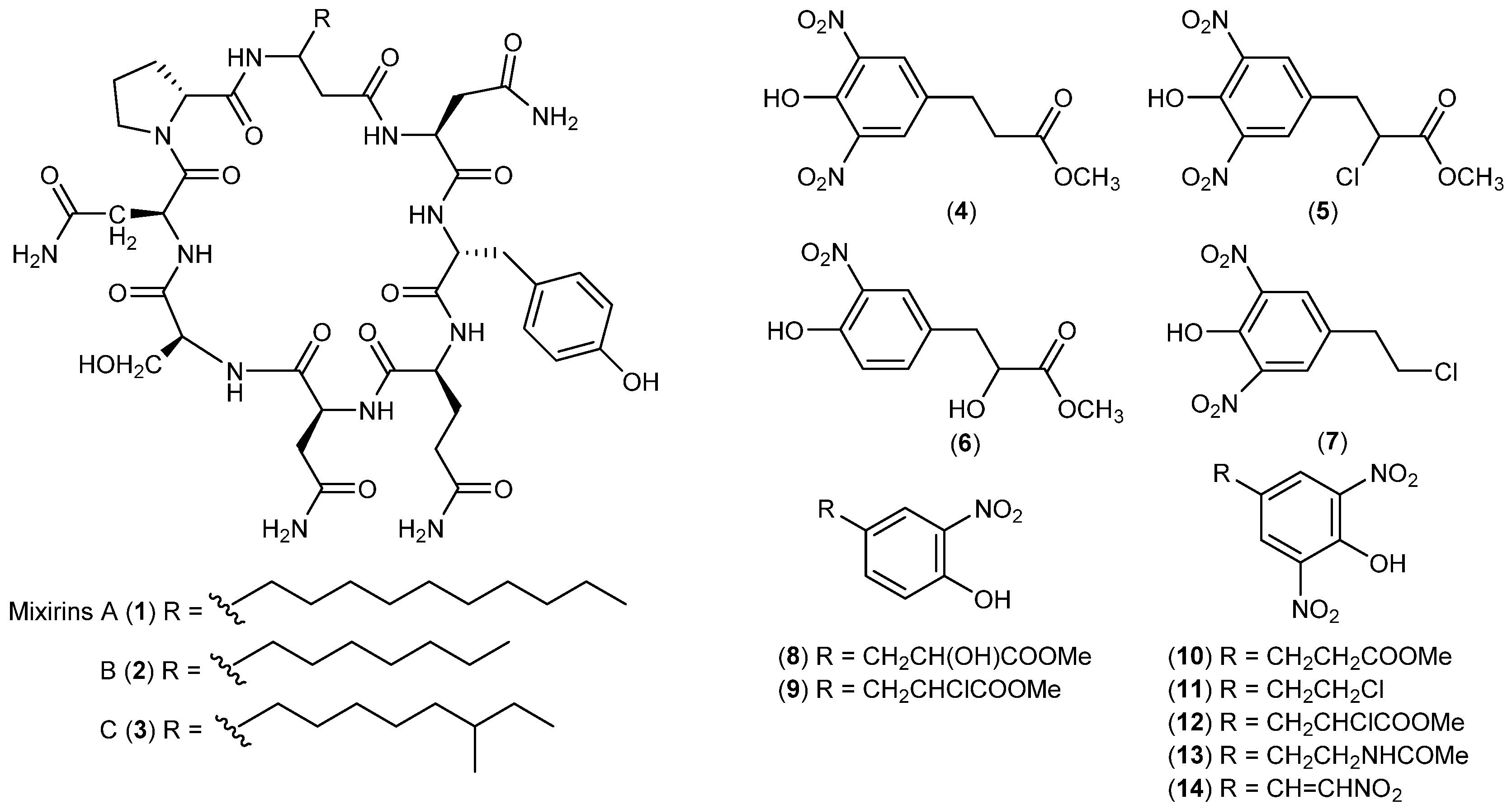 - Zhang, H.L.; Hua, H.M.; Pei, Y.H.; Yao, X.S. Three new cytotoxic cyclic acylpeptides from marine Bacillus sp. Chem. Pharm. Bull. 2004, 52, 1029–1030. [Google Scholar] [CrossRef] [PubMed]