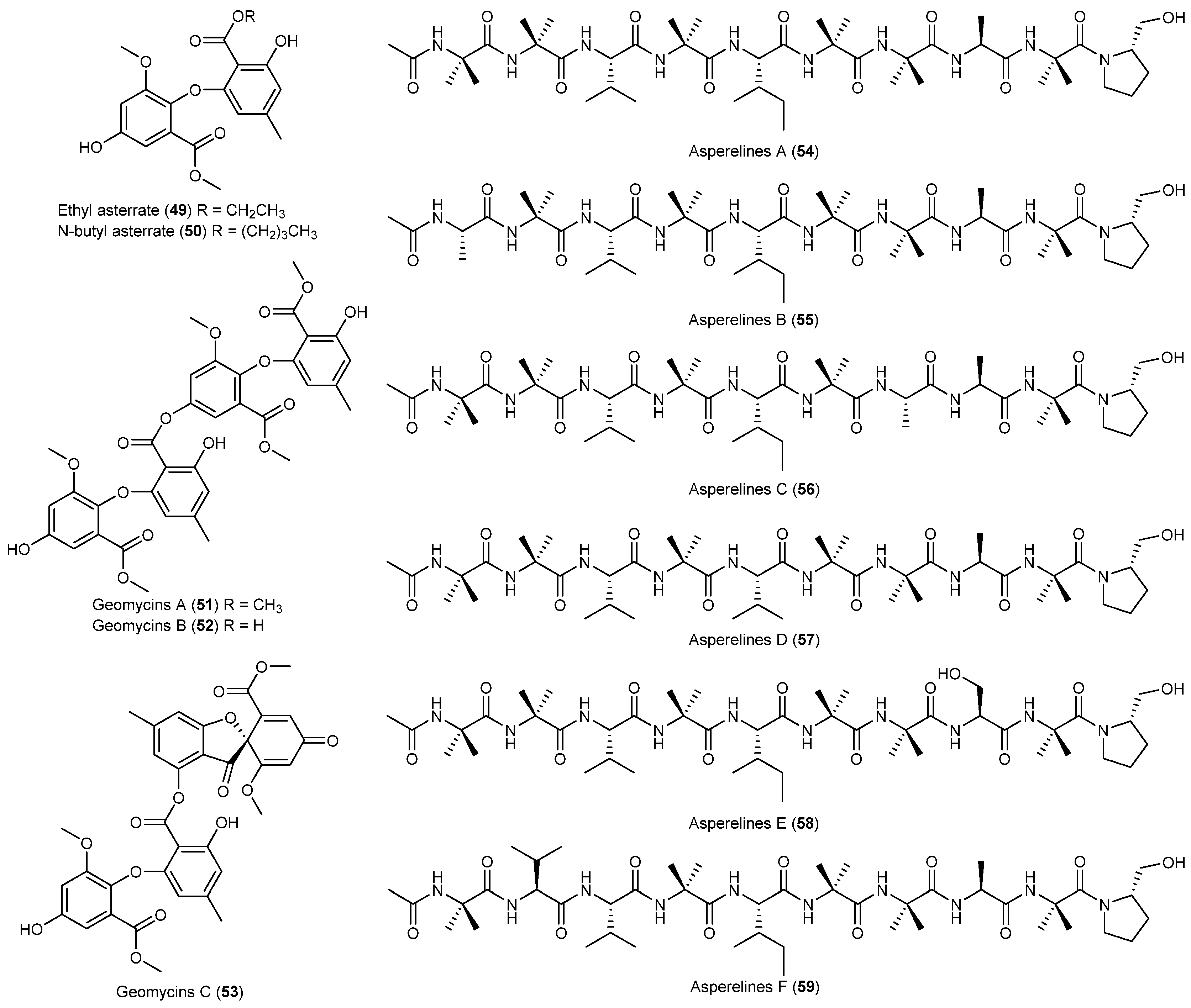 - Li, Y.; Sun, B.; Liu, S.; Jiang, L.; Liu, X.; Zhang, H.; Che, Y. Bioactive asterric acid derivatives from the Antarctic ascomycete fungus Geomyces sp. J. Nat. Prod. 2008, 71, 1643–1646. [Google Scholar] [CrossRef] [PubMed]