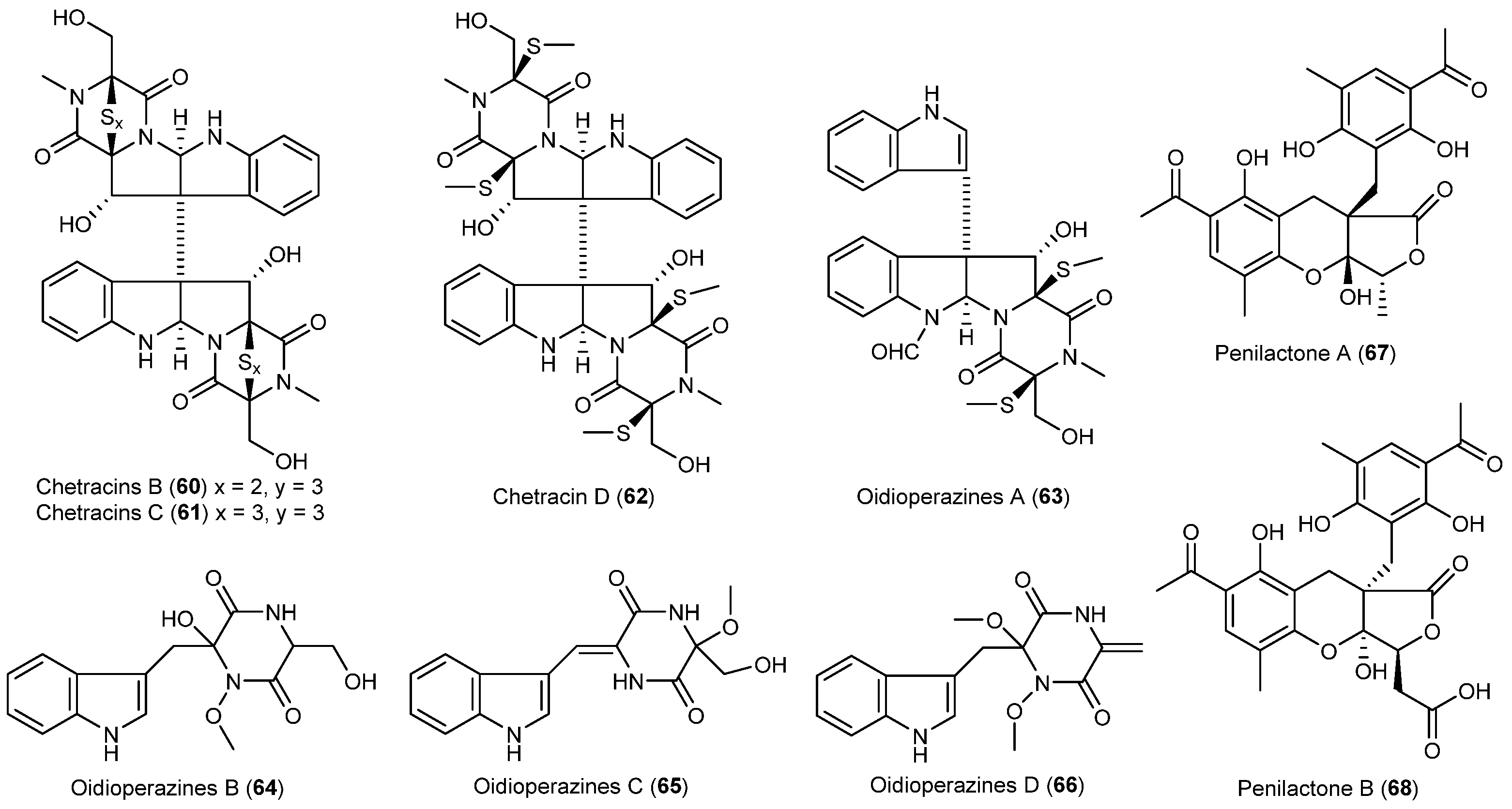 | Oidiodendron truncatum | 60–62 | Cytotoxic | Antarctic | [42] | |