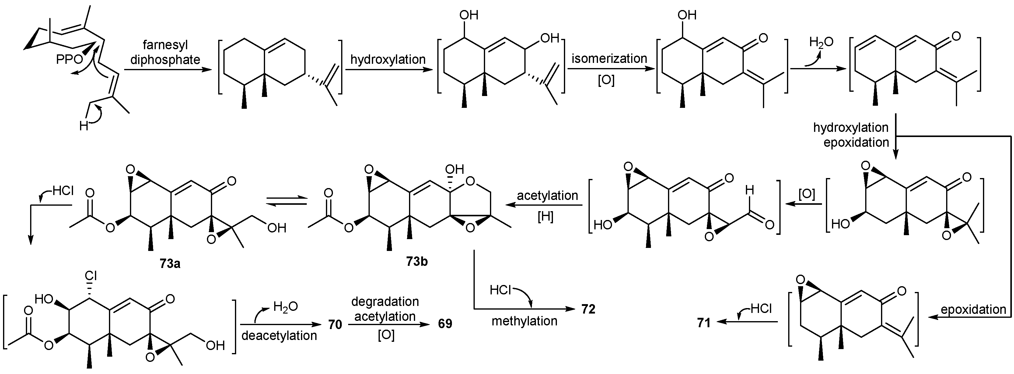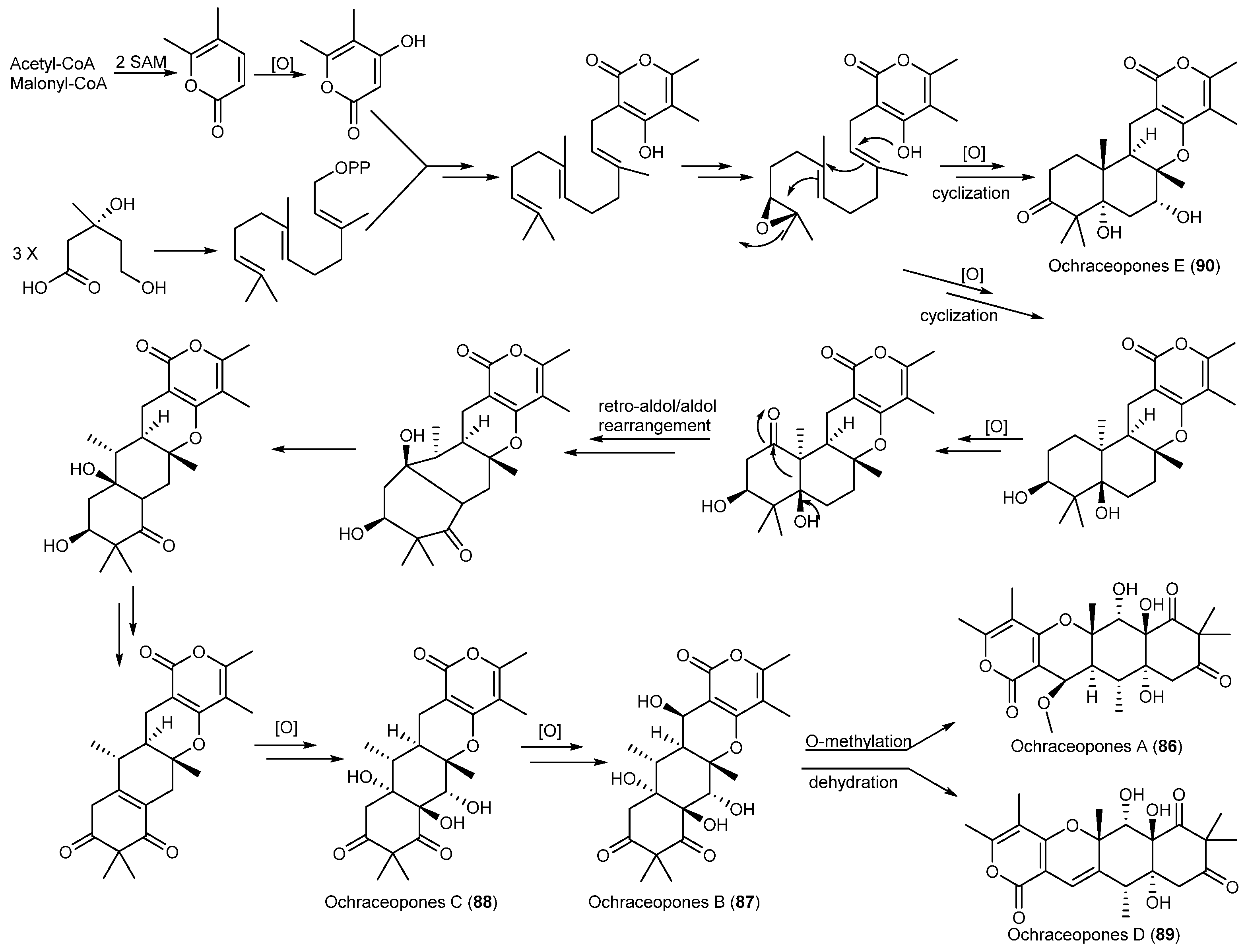 - Zhang, Z.; Chen, J.; Yang, Z.; Tang, Y. Rapid biomimetic total synthesis of (±)-rossinone B. Org. Lett. 2010, 12, 5554–5557. [Google Scholar] [CrossRef] [PubMed]