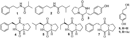 Structures of phenethylamides (1–2), cyclic dipeptides (3–7), tyrosol (8) and tyrosol acetate (9).