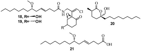 Structures of 8-epi-malyngamide C (18), malyngamide C (19), malyngolide (20) and lyngbyoic acid (21).