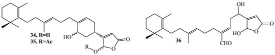 Structures of manoalide (34), manoalide monoacetate (35), and secomanoalide (36).