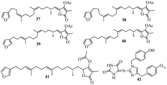 Structures of furanosesterterpenes (37–41) and isonaamine D (42).
