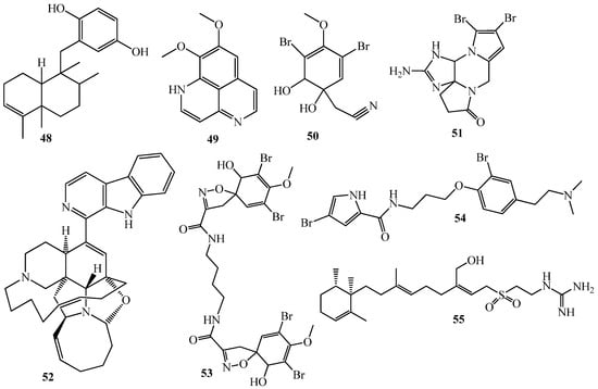 On the other hand, one terpene, (+)avarol (48) and seven alkaloids (49–55) (Figure 10), from distinct marine sponges inhibited the QS of C. violaceum CV017, along with antibiotic properties [40,101].