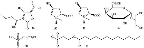 Structures of halogenated furanones, (56), betonicine (57), cis-betonicine (58), floridoside (59), and isethionic acid (60) and 2-dodecanoyloxyethanesulfonate (61).