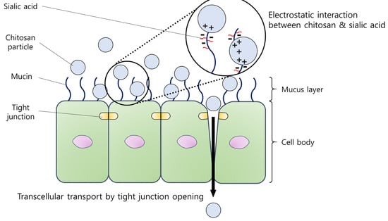Most human organs are covered by a slippery material, namely mucus. The mucus is mainly composed of glycoproteins called mucins, in which a large portion of sialic acid residues take place. Due to the abundant sialic acid residues, the mucus layer shows a negatively charged surface [18], which provides a favorable environment for chitosan to be electronically adhered (Figure 1). Many researchers have used such a phenomenon to deliver the drug locally to the mucus-covered organs [19,20,21].