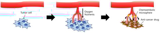 Anti-cancer drugs for chemotherapy have been continually studied for decades. Although they are largely developed up to date, some fundamental problems of anti-cancer drugs are still being mentioned. The main drawback of these drugs is severe side effects due to their systemic administration and low specificity to the tumor tissues [48]. Thus, there have been unmet needs for targeted local delivery. Selective embolization is an attractive therapy to these needs because it uses a typical feature of cancer cells, angiogenesis [49]. By occluding arteries generated by cancer cells, embolic materials can induce starvation of cancer cells (Figure 2). Until now, many types of embolic materials, such as polyvinyl alcohol (PVA) [50] or PLGA [51] were used. Despite its potency of cheapness as well as biocompatibility, non-toxicity, and biodegradability [52], chitosan has been disregarded as a candidate due to its brittleness when formulated into microspheres.