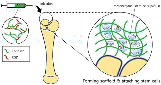 Schematic diagram of tissue regeneration. Chitosan forms a scaffold similar to extracellular matrix (ECMs), providing a suitable environment for cells to be adhered. In order to enhance the attachment of stem cells, RGD moieties were linked with the chitosan backbone. Stem cells then could proliferate on the scaffold more efficiently, ultimately regenerating the bone or cartilage tissue.