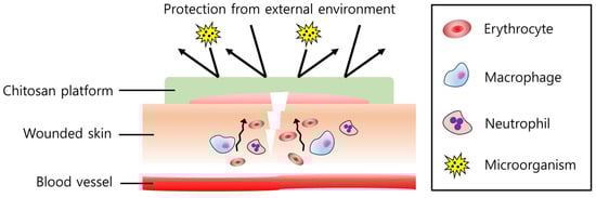 Effect of the chitosan platform on wound healing. Chitosan attracts immune cells such as macrophages and neutrophils, regulating inflammatory responses to recover the wound quickly. Erythrocytes and platelets (not described in the figure) also agglomerate at the wound site, showing hemostasis. In addition, a harmful external environment and microorganisms can be efficiently isolated by the chitosan platform.