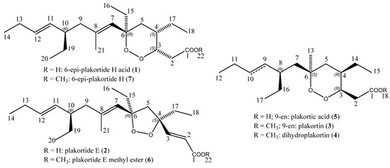 4.1. 6-Epi-plakortide H acid (1), [[(3S,4S,6R)-4,6-Diethyl-6-((1E,5E)-4-(R)-ethyl-2-methyl-octa-1,5-dienyl)-[1,2]dioxan-3-yl]-acetic acid]