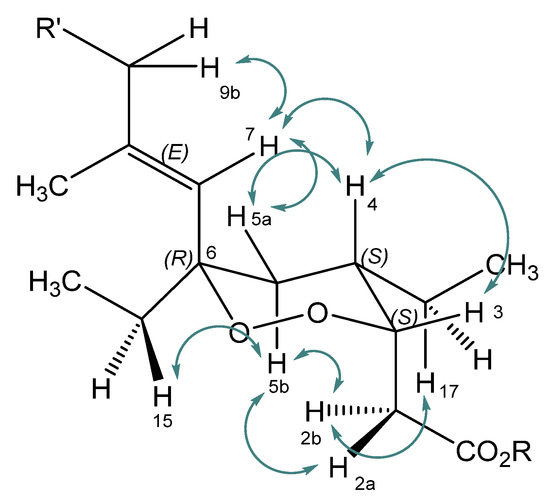 Selected nuclear Overhauser effect (NOE) correlations observed for 6-epi-plakortide H acid (1, R = H) and the methyl ester 6-epi-plakortide H (7, R = CH3).