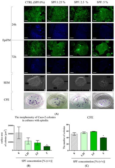 We examined the effect of SPF on the morphology and proliferation activity of Caco-2 cells, after 24 and 72 h of culture (Figure 1). Evident changes in Caco-2 colonies were notable after 72 h. The addition of SPF influenced colony sizes. The Caco-2 cultures are characterized by enterocyte-like phenotype and form large and pseudostratified colonies. In cultures with Spirulina Caco-2 created multiple spherical colonies, however, more compact and reduced in size. The morphometry analysis showed that the size of colonies decreased in a dose-depended manner, however, a statistically significant decrease of surface area of Caco-2 colonies was noted only in cultures with SPF at a concentration 5% (v/v) (Figure 1B). The clonogenic potential of Caco-2 cultures was also affected by SPF—the number of colonies slightly increased in cultures treated with SPF at 1.25% and 2.5%—but the difference was not statistically significant. SPF at 5% significantly lowered the number of CFU in comparison to the control cultures (Figure 1C).