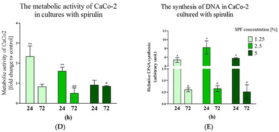 The analysis of metabolic and proliferative status of Caco-2 showed that SPF addition increased their activity after 24 h; just metabolic activity of cultures with 5% of SPF remained unaffected. The analysis performed at 72 h, showed that the decrease of metabolic activity at a statistically significant level was observed in cultures with SPF at concentrations 2.5% and 5%, while the lowered proliferation ratio was noted in Caco-2 in all cultures with SPF (Figure 1D,E).