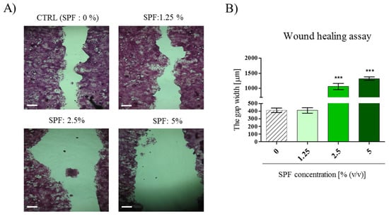 In order to perform the wound healing test, the Caco-2 cultures (p. 50) were maintained in 24-well plates, enforcing high confluency. Cell monolayers were manually wounded by scraping cultures with yellow pipette tips (0.5–0.6 mm diameter). After that, cultures were washed twice to remove the detached cells and propagated with SPF in a CO2 incubator for 24 h. Furthermore, cultures were stained with pararosaniline (Sigma Aldrich, Munich, Germany). Determination of wound closure was performed using AxioVision microscope software. The measurements of distance, obtained between the two edges of a denuded area, were performed five times and repeated independently in triplicate.