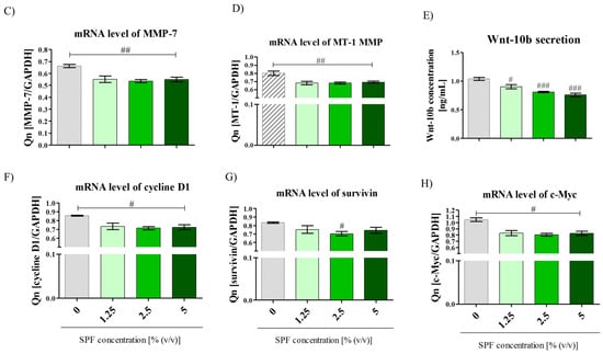 The effect of SP on the migration of Caco-2 cells. (A) The images of wound site in Caco-2 cultures with and without SPF (scale bar = 250 μm); (B) the gap width was measured and represented as mean ± SD of quadruplicate cultures from triplicate experiments, the increase in a wound gap was significant p < 0.001; (C,D) the transcript levels of MMP-7 and MT-1 after SPF treatment; (E) the effect of SPF on Wnt-10b autocrine secretion determined with the ELISA; (F–H) the mRNA levels of downstream target genes of the signaling pathway crucial for tumor survival. Statistically significant differences were indicated with hashtag (#) in order to mark the decrease of investigated feature. The statistically significant differences were noted at p < 0.05 (#); p < 0.01 (##) and p < 0.001 (###).