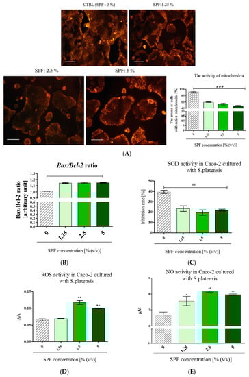 Mitochondria in Caco-2 cultures were visualized using fluorescent Mito Red staining. The analysis of staining intensity showed that the number of active mitochondria in Caco-2 decreased in cultures with SPF in a dose-dependent manner. Additionally, the intense fluorescence signal of Mito Red was observed mainly in cells forming outside layers of colonies (Figure 3A). In addition, following the SPF treatment the Bax/Bcl-2 ratio increased (Figure 3B). Furthermore, to determine the possible mechanism of SPF cytotoxic action the oxidative stress markers were evaluated. The analysis revealed that SOD activity was significantly lowered in cultures with SPF addition. The SOD level in all cultures with SPF decreased by approximately 50% when compared to non-treated cultures (Figure 3C). Simultaneously, the increased ROS and NO activity was noted in cultures with SPF at concentrations of 2.5% and 5% (Figure 3D,E). This result suggests that intracellular ROS and NO generated in Caco-2 cultures after SPF treatment may be involved in the induction of cell death.