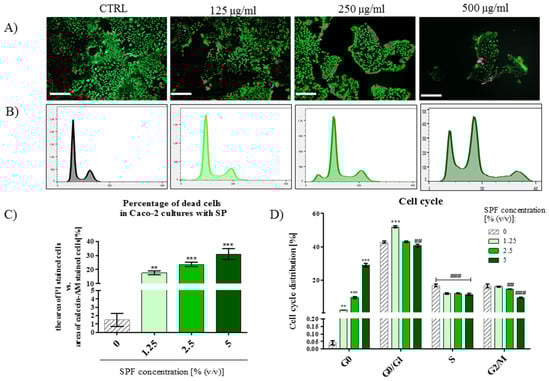 Cell death induced by SPF was determined by the live/dead assay (Figure 4A), while the cell cycle was analyzed by flow cytometry (Figure 4B). Due to the differences in the size of Caco-2 colonies, the percentage of dead cells, stained with propidium iodide, was evaluated in regards to the area occupied by living cells, visualized with calcein-AM staining (Figure 4C). The percentage of dead cells increased along with the increasing SPF concentration, thus obtained results are another confirmation of dose-dependent cytotoxicity of SPF against Caco-2 cell line. Moreover, the analysis of cell cycle distribution confirmed that Caco-2 treated with SPF underwent cell death, as judged by the increase on sub-G0 percentage. The percentage of proliferating cells (S phase) was also significantly lowered after SPF treatment (Figure 4B,D).