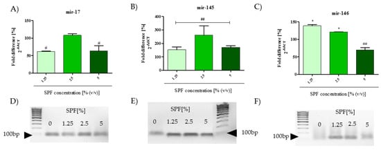 Additionally, the expression of miRNA17 was downregulated or remained unchanged in response to SPF treatment (Figure 5A,D). Mir-145 expression was noted in all tested cultures in regard to control conditions (Figure 5B,E). The significant upregulation of the miR-146 transcript level was noted in cultures with 1.25% and 2.5% of SPF. However, the highest concentration of SPF decreased the miR-146 level in Caco-2 (Figure 5C,F). The obtained results indicate the loss of invasive ability of Caco-2 and are in good agreement with results obtained in the wound-healing assay.