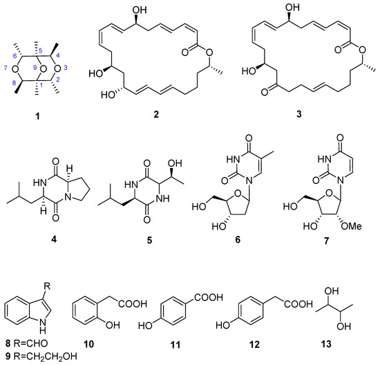 By comparison of the NMR and MS spectroscopic data with those reported in the literature, 12 known compounds were then identified to be macrolactin A (2) [10], macrolactin F (3) [11], cyclo(d)-Pro-(d)-Leu (4) [12] cyclo-(Leu-Thr) (5) [13], thymidine (6) [14], 2′-O-methyluridine (7) [15], indol-3-carbaldehyde (8) [16], 2-(1H-indol-3-yl)ethan-1-ol (9) [17], 2-hydroxy phenyl acetic acid (10) [18], 4-(hydroxymethyl)phenol (11) [15], 2-(4-hydroxyphenyl)-ethanol (12) [19], and 2,3-butanediol (13) [20].