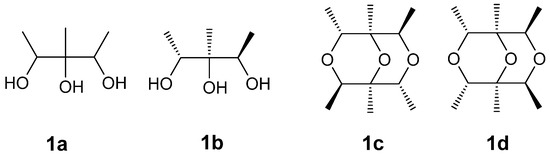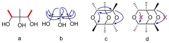 Compound 1 was obtained as a colorless oil. Its molecular formula was determined as C12H22O3 on the basis of the prominent pseudomolecular peak at m/z 237.1464 ([M + Na]+) in the positive HRESIMS spectrum. The 1H-NMR spectrum exhibited two methyl doublets [δH 1.15 (3H, d, J = 6.3 Hz); 1.17 (3H, d, J = 6.3 Hz)], one methyl singlet (δH 1.03, 3H, s), and two oxygenated methines [δH 3.81 (1H, q, J = 6.4 Hz), 3.83 (1H, q, J = 6.4 Hz)]. These signals were supported by resonances in the 13C and Dept-135 NMR spectra, which exhibited six carbons comprising three methyls (δc 17.4 q, 17.6 q, and 17.8 q), two methines (δc 72.1 d, 72.2 d), and one oxygenated quaternary carbon at δc 76.2 s (Table 1). In the 1H-1H COSY spectrum, δH 1.15 and δH 1.17 were correlated to δH 3.81 and δH 3.83, respectively, indicating connections of δc 17.4 to δc 72.1 and δc 17.6 to δc 72.2 (a in Figure 2). Unfortunately, the poor quality of the HMBC correlations of 1 in CD3OD could not be used further to elucidate its structure because of the seriously overlapped signals. Alternatively, the deuterated DMSO was adopted and another new 1D and 2D NMR experiments were carried out. The significant correlations were found of δH 1.01 (3H, d, J = 6.4 Hz) to δC 69.2 d, δC 74.3 s; δH 0.89 s to δC 69.2 d, 74.3 s, and 70.3 d; δH 1.02 (3H, d, J = 6.4 Hz) to δC 74.3 s and δC 70.3 d (b in Figure 2). Therefore, the planar structure of 1 was deduced as 1,2,3-trimethylglycerol (1a in Figure 3). Since the chemical shift of δH 1.01/δH 3.68 and δC 17.5/δC 69.2 were slightly different from those of δH 1.02/δH 3.61 and δC 17.5/δC 70.3, the relative configuration of 1 could be determined as 1R*,2S*,3R*-trimethylglycerol (1b in Figure 3). Taking its molecular formula into consideration, 1 must be a symmetrical molecule constructed by 1b through dehydroxylation reaction. This could also be confirmed by the absence of three hydroxyl signals of its 1H-NMR spectrum in DMSO-d6. Further HMBC correlations of δH 3.68 to δC 70.3 d, δH 3.61 to δC 69.2 d (c in Figure 2), and the missing correlations of δH 3.68 to δC 69.2, δH 3.61 to δC 70.3 (d in Figure 2) confirmed its structure must be 1c instead of 1d (Figure 3). On the basis of the above evidence, Compound 1 was determined as (1S*,2R*,4R*,5S*,6R*,8R*)-1,2,4,5,6,8-hexamethyl-3,7,9-trioxabicyclo[3.3.1]nonane.
