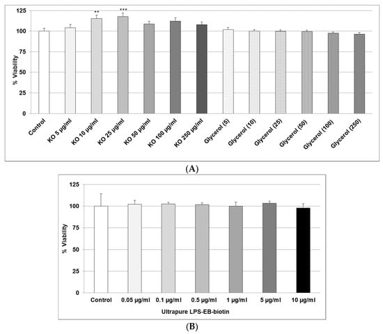 (A) Effects of 24 h treatment with KO emulsion or the glycerol vehicle (numbers in brackets indicate the volume of glycerol used in the corresponding KO concentration), on the viability of THP-1 macrophages. Values (in % viability of cells without treatment (control = 100%)) are given as the mean + SEM; ANOVA test, significance vs. negative control, ** p ≤ 0.01, *** p ≤ 0.001; n = 7 independent experiments; and (B) the effects of 4 h treatment with ultrapure LPS-EB-biotin on the viability of differentiated human THP-1 macrophages. Values (in % viability of cells without treatment (control = 100%)) are given as the mean + SEM; n = 4 independent experiments.