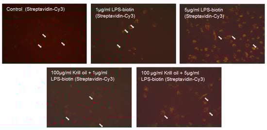 Effect of the KO emulsion on the LPS binding by differentiated human THP-1 macrophages. Photographs of the inhibitory effect of KO on the binding of ultrapure LPS-EB-biotin after 24 h incubation, was detected with streptavidin-Cy3-conjugated as fluorochrome. White arrows: nuclei. Magnification: 200×.