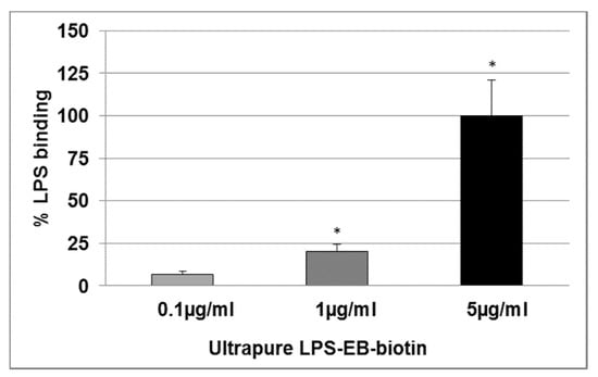 LPS (1 µg/mL) pre-incubated with KO (100 µg/mL) inhibited the binding, but not when using LPS at a concentration of 5 µg/mL (Figure 2). The LPS binding was increased at 0.1 µg/mL (6.5%), 1 µg/mL (20.3%, p ≤ 0.05), and 5 µg/mL (100%, p ≤ 0.05) when compared with the negative control (Figure 3).