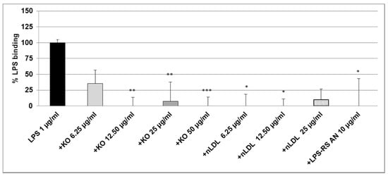 As the LPS-binding control, 25 µg/mL nLDL showed a similar effect as KO at 12.5 µg/mL, however, this was not significant. LPS-RS-AN antagonist significantly (p ≤ 0.01) prevented the binding of LPS-biotin and, thus, mimicked the effect of KO (Figure 4). A total and significant inhibition of the binding was obtained when 1 µg/mL LPS-EB was co-incubated with 6.25, 12.5 µg/mL (p ≤ 0.01), 25 µg/mL (p ≤ 0.01), or 50 µg/mL (p ≤ 0.001) KO when compared with the control. Furthermore, LDL showed a similar inhibition pattern as KO. Additionally, the LPS-RS antagonist completely inhibited the LPS binding on the TLR4 (Figure 5). Moreover, we have performed this experiment using 5 µg/mL LPS-EB-biotin, however, without a statistically significant difference between LPS/KO co-incubation and LPS alone (data not shown).