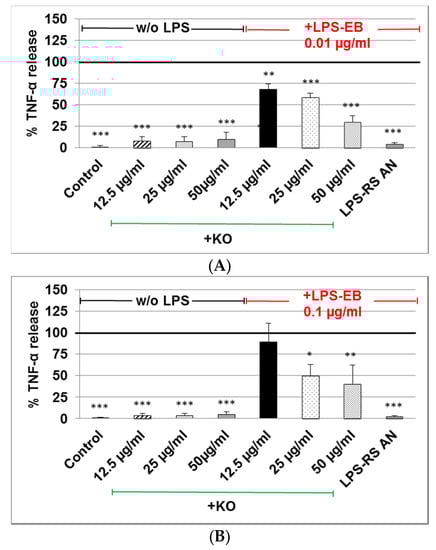 Analyses (by ELISA) of the inhibitory effect of KO emulsion on the TNF-α release by LPS-EB differentiated human THP-1 macrophages. (A) LPS-EB 0.01 µg/mL, or (B) 0.1 µg/mL was co-incubated overnight together with different concentrations of KO or 10 µg/mL LPS antagonist (LPS-RS-AN) and afterwards for 3 h with the differentiated THP-1 macrophages. Values (in %TNF-α release relative to positive (LPS-EB) control (=100% release)) are given as the mean + SEM; ANOVA test, significance vs. positive control (=LPS-EB), * p ≤ 0.05, ** p ≤ 0.01, *** p ≤ 0.001; n = 3–5 independent experiments.
