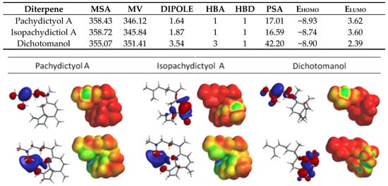 Stereoelectronic parameters of pachydictyol A, isopachydictyol A, and dichotomanol including Molecular Surface Area (MSA = Å2), Molecular Volume (MV = Å3), Dipole moment (debye), number of hydrogen bond acceptors/donors (HBA and HBD), Polar surface area (PSA = Å2), and HOMO and LUMO energies (EHOMO and ELUMO = eV) and HOMO (up) and LUMO (down) coefficient distribution and density maps. In the density map (right), the lowest orbital density areas are in red and the highest are in blue.