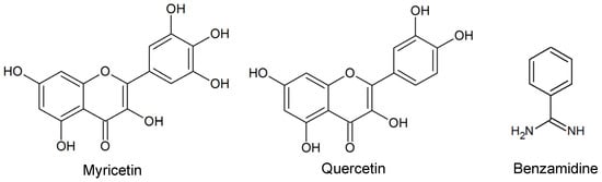 Many molecules from natural extracts (e.g., flavonoids) have been described with high susceptibility to nucleophilic attacks from proteases [36] such as flavonoids myricetin and quercetin also recently described in Himanthalia elongate (Figure 4) [37]. According to the literature, some of these flavonoids present a significant inhibitory profile against thrombin due to the presence of hydroxyl groups that mediate binding to thrombin aminoacid residues. Moreover, thrombin inhibition has also been shown to be positively correlated to the number of hydroxyl groups present in the flavonoid moiety [38]. This particular feature has been correlated with the inhibition of multi-subunit proteases complex such as the proteasome [36] and smaller serine proteases such as thrombin and Dengue virus NS2B-S3 [28,39].