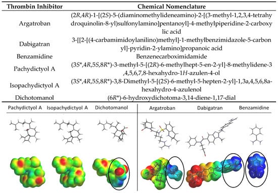 Comparison of chemical composition, 3D structure and electrostatic potential maps of pachydictyol A, isopachydictyol A, and dichotomanol with Direct Thrombin Inhibitors-DTI (argatobran and dabigratan), and the serine protease classic inhibitor benzamidine. The putative binding region of the most active diterpene dichotomanol and the binding region of DTIs and benzamidine are circled in black. The electrostatic potential maps range is from −80 to 140 kJ/mol.