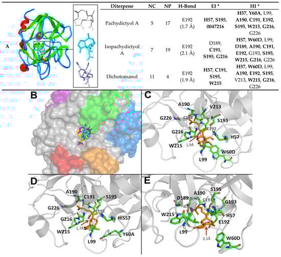 Comparison of 3D structure and docking data complexes of pachydictyol A, isopachydictyol A, and dichotomanol with human alpha-thrombin catalytic site (PDB: 1PPB). (A) The 3D-structural alignment reveals the diterpenes localization within the catalytic site and the different conformation of each diterpene (pachydictyol A, light gray; isopachydictyol A, cyan; dichotomanol, purple) (right) as well as the parameters analyzed including number of clusters (NC) and poses (NP) on the lowest energy cluster, hydrogen-bond (H-bond), electrostatics interactions (EI) and hydrophobic interactions (HI) (left). (B) Diterpene proximity to thrombin binding regions including ABE-I (marine), ABE-II (purple), Na+ binding site (red), 60-loop (green), and γ-loop (orange). Zoom of the diterpenes (orange) dichotomanol (C); pachydictyol (D); isopachydictyol (E) bound to thrombin (green) with arrow pointing to the most important hydrogen bond (magenta). * Bold = thrombin residues that also interact with the flavonoids myricetin and quercetin according to Mozzicafreddo et al. 2006 [28].