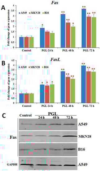 We investigated whether Fas protein levels changed in PGL-treated cancer. The three cancer cell lines were treated with PGL (0 and 60 µg/mL) for 24, 48, and 72 h, and the Fas protein levels were examined by western blotting. Western blotting was performed according to the standard protocol described in our previous study [27]. The proteins were extracted from A549, MKN28, and B16 cells, and approximately 50 µg of protein sample were separated by SDS-PAGE (10% polyacrylamide gels) and probed with a primary antibody against Fas (1:550, Sangong Biotech, Shanghai, China). Glyceraldehyde-3-phosphate dehydrogenase (GAPDH) (1:2000, Cell Signaling Technology, Beverly, MA, USA) was used as an internal control. Protein band intensities were quantified by densitometry using an Odyssey infrared imaging system ((Li-Cor, Lincoln, NE, USA).