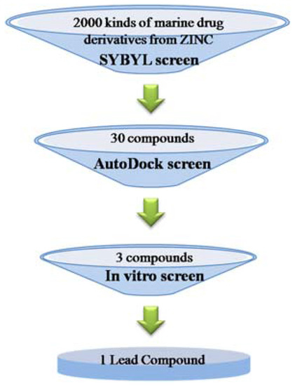 Pharmacophore-based virtual screening was used to find novel potential leads from a ligand database and the general protocol was summarized in Figure 1. DISCOtech module of the SYBYL 7.3 program package [26,31] was used to identify structural features. Further, 3D alignments of the pharmacophore features in desirable molecules with benzene ligand(s) and/or structure core of nitrogen heterocyclic ring, i.e. with the expected structure properties similar to the previously reported marine natural fungicides [10,11,12,13], are found by automatically iterating through experimentally adjustable parameters. The distance tolerance between the pharmacophore features in the overlaid structures was set to 0.25 Å, and gradually increased to 2.5 Å if no model was available with the lower tolerance setting (step size 0.25). The head 30 compounds that matched the main features of the pharmacophore model were exported as candidate hits for following molecular docking. Molecules, structurally matching all the features of ligand model, were selected as hits, and the percentage of the similarity was defined as query fit (Qfit) value.