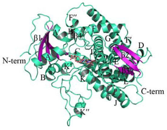In the current study, we have constructed a PiCYP51A model for the first time with the core region of PiCYP51 proteins (Figure 2), containing the most conserved fold structure reported in the other P450 proteins [16,17,18,21,22,23], including helices E, I, J and L. Each of these helices has at least two aromatic-ring-containing residues (Phe and/or Tyr) involved in the hydrophobic interacting with some specific receptor(s). On the other hand, the present PiCYP51A model also suggested the critical role of nitrogen (N) atoms in the azole and aromatic rings in the coordination bond formation, as experimentally reported for the ligand-heme Fe(II) interaction in PiCYP51A active site [4].