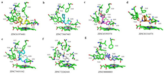 3D-conformation of PiCYP51A docking with six candidate compounds. The six candidate compounds’ IDs are listed as (a) ZINC61974481, (b) ZINC73667465, (c) ZINC65393574, (d) ZINC81316574, (e) ZINC74431162, (f) ZINC72242441, and (g) ZINC00000803.