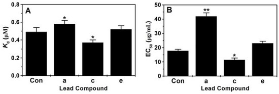 In vitro binding constants (Kd) and EC50 of the selected lead compounds. (A) In vitro analysis of binding constants (Kd); (B) EC50 assay; Con: Triazolone, a patent fungicide used as control. (* p < 0.05; ** p < 0.01).