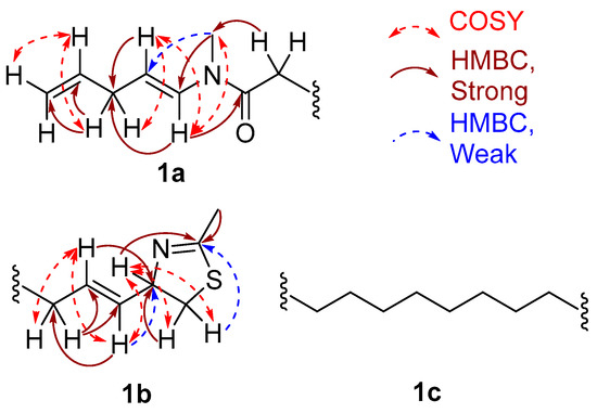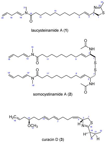 The two partial structures, 1a and 1b, were connected by a saturated linear alkyl chain (1c, C-6 to C-13) to form the final planar structure of compound 1. The insertion of eight methylene groups between C-5 and C-14 satisfied the molecular formula, and was supported by COSY and HMBC correlations between the terminal atoms of partial structures 1a and 1b and the shielded methylene envelope of resonances of partial structure 1c (Figure 4). Consequently, the planar structure of laucysteinamide (1) was shown to be an alternately condensed form of a monomer of the symmetrical dimeric metabolite somocysteinamide A (3) [6].