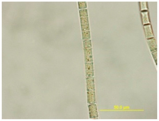 Microscopic image of filaments of the cf. Caldora penicillata species (100×).