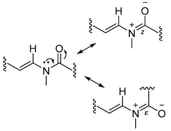The substructures of an amide (1a) and a 2-methyl-4-thiazolinyl ethenyl moiety (1b) were constructed according to interpretation of 1D and 2D NMR data obtained from 1H-1H Correlation Spectroscopy (COSY) and 1H-13C Heteronuclear Single Quantum Coherence (HSQC), Heteronuclear 2 Bond Correlation (H2BC), and Heteronuclear Multiple Bond Correlation (HMBC) experiments (Figure 4). The HSQC data allowed for the assignment of the combined three-proton signals at δH 2.35 and 2.90 to the cis/trans isomers of the N-methyl amide carbon (δC 31.4 and 29.6, C-21), respectively. The HMBC correlations from δH 2.35 to the sp2 methine and carbonyl carbons, δC 129.0 (δH 7.80, d, J = 14.4 Hz, C-16) and 170.5 (C-15), respectively, were not observed in the 1H-13C H2BC spectrum, thus suggesting the occurrence of an N-methyl enamide moiety. For the configurational isomer with CH3-21 at δH 2.90, HMBC correlations were observed with analogous carbons at δC 130.1 (δH 6.42, d, J = 13.8 Hz) and 170.2. By COSY and J-coupling analysis, the H-16 methine resonances were located adjacent to another set of divided proton signals [δH 4.61 (dt, J = 13.8, 6.6 Hz) and 4.66 (dt, J = 14.4, 7.2 Hz) (1H together, H-17)], with corresponding carbon resonances at δC 107.2 and 106.9. The magnitude of the J-coupling between H-16 and H-17 suggested a trans-double bond configuration. A deshielded methylene group [δH 2.60 (t, J = 6.1 Hz) and 2.68 (t, J = 6.1 Hz) (2H together, H-18), δC 34.7] was adjacent to C-17 according to H2BC correlations. 1H-1H COSY data sequentially connected the protons of CH2-18, alkenyl CH-19 [(δH 5.78 (m) and 5.80 ppm (m) (1H together), δC 137.5 and 138.0] and the alkenyl terminus CH2-20 [δH 5.03 (m, 2H), 114.9 and 115.2]. Completing partial structure 1a was a moderately deshielded methylene group at δH 2.09 (2H, t, J = 7.2 Hz), δC 33.6), located next to the carbonyl by HMBC and H2BC correlations. The two sets of 1H-NMR and 13C-NMR chemical shift data for each carbon and proton from C-14 to C-21 is explained by conformational anisotropy caused by cis/trans isomerism of the corresponding N-methyl quaternary imine (Figure 5), as described previously [6,9]. The cis/trans ratio between these isomers (0.44:1) was calculated in C6D6 at 20 °C using peak integrals from the 1H-NMR spectrum.
