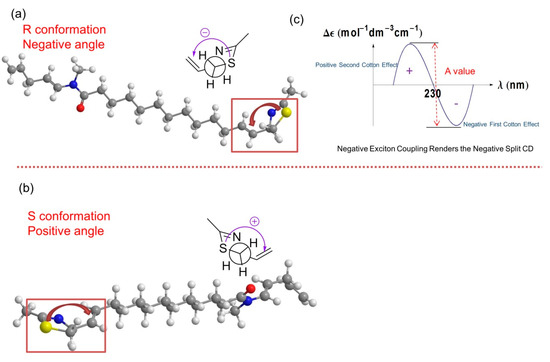 Molecular Modeling and exciton coupling circular dichroism (ECCD) prediction. (a) The stick-ball model of the R configuration of compound 1 and its Newman projection of the relevant thiazoline moiety. The angle between the two chromophores in the model is negative (counterclockwise). Atom definitions: red, oxygen; yellow, sulfur; blue, nitrogen; gray, carbon; white, hydrogen; (b) The stick-ball model of the S configuration of compound 1 and its Newman projection of the relevant thiazoline moiety. The angle between the two chromophores in the model is positive (clockwise). Atom definitions as in panel a; (c) The R conformation of compound 1 with negative exciton coupling renders the negative split ECCD curve as indicated by the experimental result shown in Figure S11.